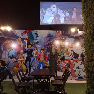 A música ambiente é as aberturas de One Piece, que são passadas em quatro telas nos mais diferentes pontos da hamburgueria para relembrar momentos marcantes do anime e conversar sobre.